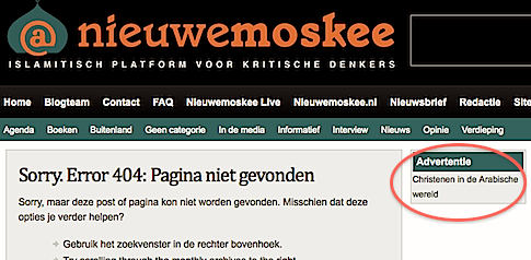» Mijn aandacht werd getrokken door deze advertentie: "Christenen in de Arabische wereld". Die advertentie komt op bijna alle pagina's voor, een beetje eenzaam ook. Wanneer je klikt op de link krijg je de hier afgebeelde pagina: "niet gevonden". Hm.